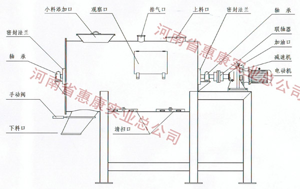設(shè)備分內(nèi)外多層螺帶,筒身為圓形,通過(guò)攪拌軸的高速旋轉(zhuǎn),使內(nèi)外螺旋帶在較大范圍內(nèi)翻動(dòng)物料,內(nèi)螺旋帶推動(dòng)物料向兩側(cè)對(duì)流運(yùn)動(dòng),外螺旋帶推動(dòng)物料由兩側(cè)向 內(nèi)運(yùn)動(dòng),同時(shí)部分物料在螺旋帶推動(dòng)下,沿軸向徑向運(yùn)動(dòng),從而形成對(duì)流剪切,實(shí)現(xiàn)全方位無(wú)死角深度混合,使物料在較短時(shí)間內(nèi)實(shí)現(xiàn)快速均勻混合。