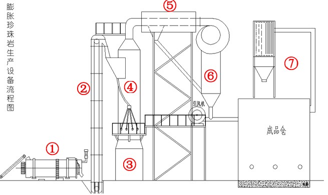原砂—預(yù)熱爐—斗式提升機—珍珠巖膨脹爐—水冷系統(tǒng)—蝸牛式分離器—風(fēng)送系統(tǒng)—稱量包裝—除塵系統(tǒng)